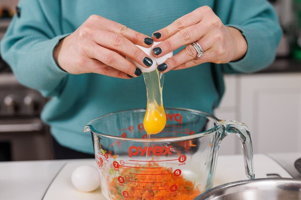Continue your wet ingredients by cracking the eggs into the bowl.